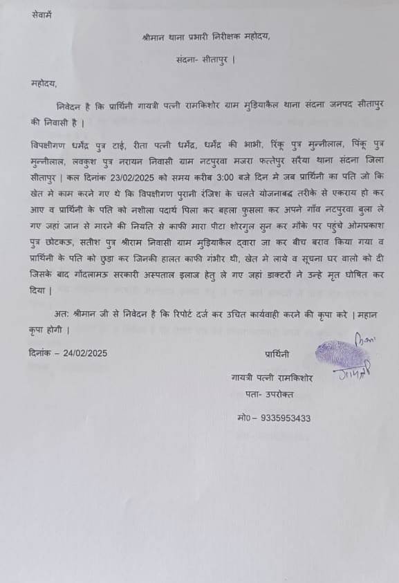 घटना रविवार दोपहर करीब 3 बजे की है। रामकिशोर अपने खेत में काम कर रहे थे। इसी दौरान नटपुरवा मजरा फत्तेपुर के धर्मेंद्र, उसकी पत्नी रीता, धर्मेंद्र की भाभी, रिंकू, पिंकू और लवकुश वहां पहुंचे। मृतक की पत्नी गायत्री का आरोप है कि इन लोगों ने पुरानी रंजिश के चलते पहले रामकिशोर को नशीला पदार्थ पिलाया। फिर उन्हें अपने गांव ले जाकर मारपीट की।