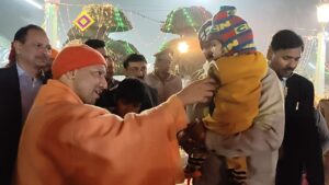 श्रद्धालुओं से मिले सीएम योगी, बच्चों को दुलारा