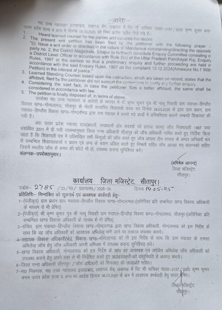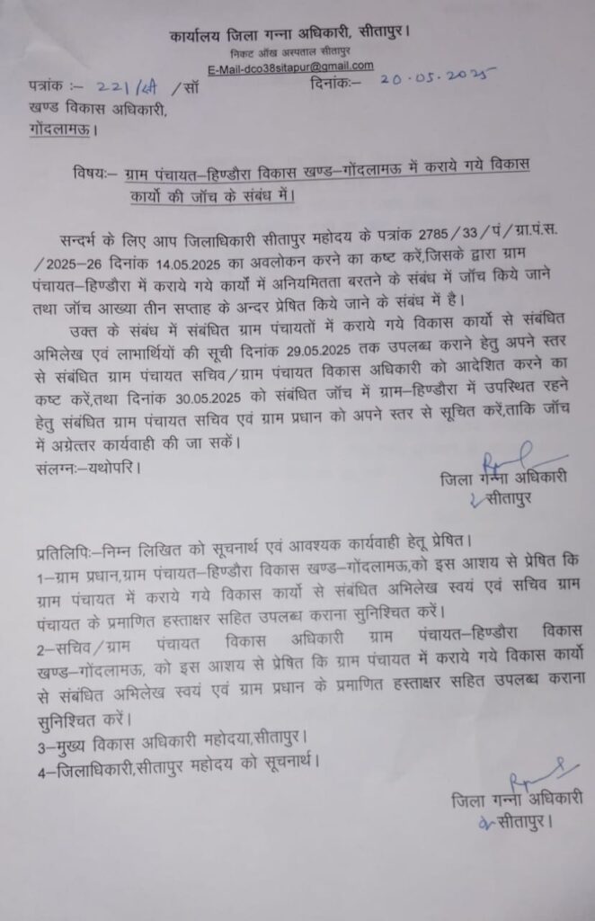 सीतापुर। विकास खंड गोंदलामऊ की ग्राम पंचायत हिंडौरा में कथित अनियमितताओं की जांच के आदेश दिए गए हैं। यह कार्रवाई उच्च न्यायालय के निर्देश पर की जा रही है।