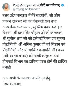 योगी सरकार के नवनियुक्त मंत्रियों को आवंटित किए गए विभाग, राजभर पंचायतीराज, दारा को मिला कारागार विभाग