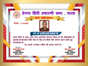 प्रेरणा हिंदी प्रचारिणी सभा के राष्ट्रीय अध्यक्ष डॉ लाल सिंह किरार ने बताया कि कवि गुरुदीन वर्मा आजाद जी को विभिन्न संस्थाओं ने सम्मानित किया है जो कि उनके व्यक्तित्व व कृतित्व को मूल्यांकित करता है.