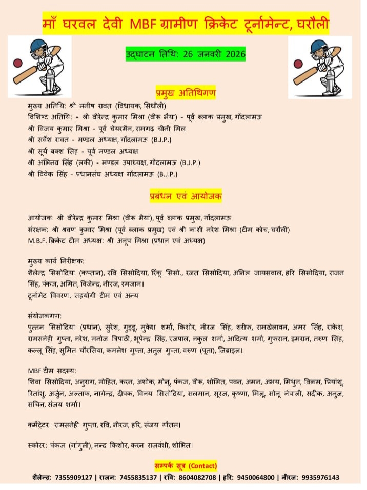 सीतापुर। विकास खण्ड गोंदलामऊ क्षेत्र के धरौली गांव में MBF ग्रामीण क्रिकेट टूर्नामेंट का भव्य शुभारंभ 26 जनवरी 2026 को गणतंत्र दिवस के अवसर पर किया जाएगा। यह टूर्नामेंट क्षेत्र में पिछले लगभग 20 वर्षों से निरंतर आयोजित होता आ रहा है और ग्रामीण प्रतिभाओं को मंच देने का कार्य कर रहा है।