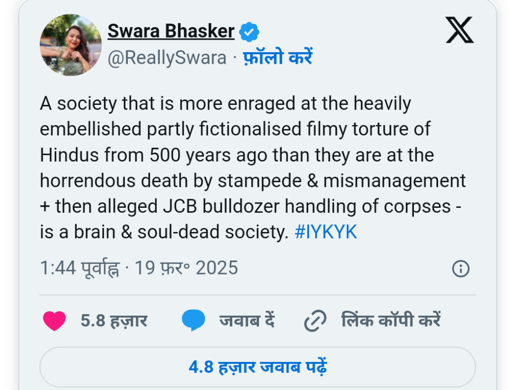 - स्वरा भास्कर ने अपने एक्स अकाउंट पर लिखा,’एक ऐसा समाज जो भगदड़ और व्यवस्था का अभाव झेल रहा है और भयानक मौतों के बाद लाशों को बुलडोजर से उठाए जाने का दृश्य देख रहा है। ऐसे में लोग फिक्शनल फिल्म में हिंदुओं के साथ 500 साल पहले हुई यातनाओं से ज्यादा क्रोधित है, ऐसी सोसाइटी दिमाग और आत्मा से मरी हुई है।