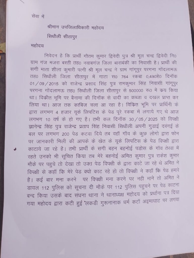 सीतापुर। सिधौली तहसील के गांगूपुर गांव में यूकेलिप्टस के पेड़ों की अवैध कटाई का मामला सामने आया है। गौतम कुमार द्विवेदी ने अपनी मां शीला कुमारी के नाम पर सितंबर 2015 में राजेंद्र प्रसाद सिंह से लगभग छह बीघा जमीन खरीदी थी।