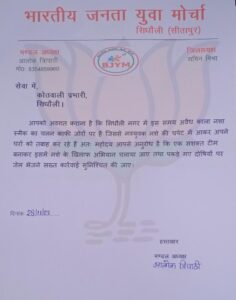 सीतापुर : उत्तर प्रदेश को नशा मुक्त बनाने के लिए शासन में प्रशासन भरपूर प्रयास कर रहा है वहीं भाजपा के संगठन युवा मोर्चा के कार्यकर्ताओं का कहना है कि अभी तक उत्तर प्रदेश पूर्णतया नशा मुक्त नहीं हुआ है जिसको लेकर भारतीय जनता युवा मोर्चा मंडल अध्यक्ष आलोक त्रिपाठी ने कोतवाली क्षेत्र सिधौली में लिखे शिकायती पत्र देकर कस्बे में फैल रहे.